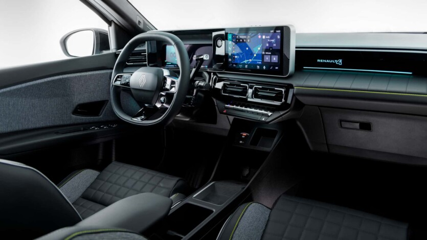 طراحی فضای کابین رنو 4 نیز به رنو 5 شباهت دارد، هرچند که با توجه به فاصله بیشتر بین محورها، فضای بیشتری ارائه میدهد. از مهمترین ویژگیهای این بخش میتوان به صفحه نشاندهنده 10.1 اینچ، نمایشگر لمسی 10 اینچ و البته تعدادی دکمه فیزیکی اشاره کرد.