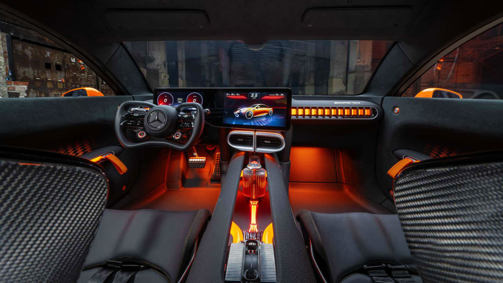 • نمایشگر دوتایی گسترده صندوق‌دار و فرمان یوغی به‌همراه پدال‌های شیفتر و نورپردازی نارنجی با الهام از المان‌های مسابقه‌ای.